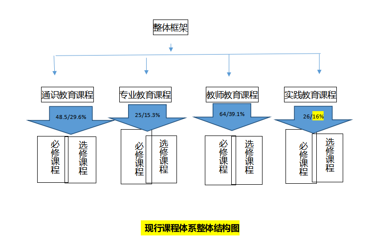 紧扣培养目标和毕业要求,构建了通识课程、专业教育课程、教师教育课程、实践教育课程等组成的课程结构,体现通识教育和专业教育的有机结合,理论课程与实践课程、必修课与选修课设置合理。如下图: