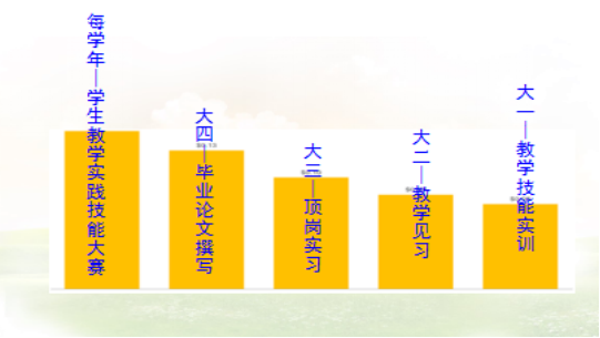 口语表达能力(朗读、备稿演讲、即席演讲),师范专业技能(教学设计、说课、模拟上课、手工、讲故事、手指操律动),旨在提高师范生教学技能水平,以保持和强化师范特色。每年举行一次。