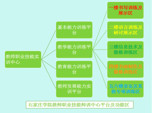 (2)语言训练及研讨区,主要分布于实训中心二三楼,包含教师口语实训室、师德与礼仪实训室、班级与社团活动室、学科教学法研究室等。